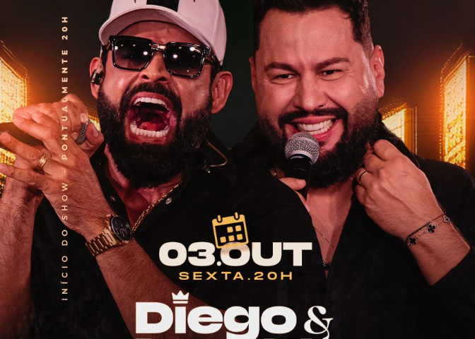 No dia 03/10, a dupla Diego & Arnaldo promete animar a arena da EXPO Rio Preto com seu repertório cheio de sucessos, como: