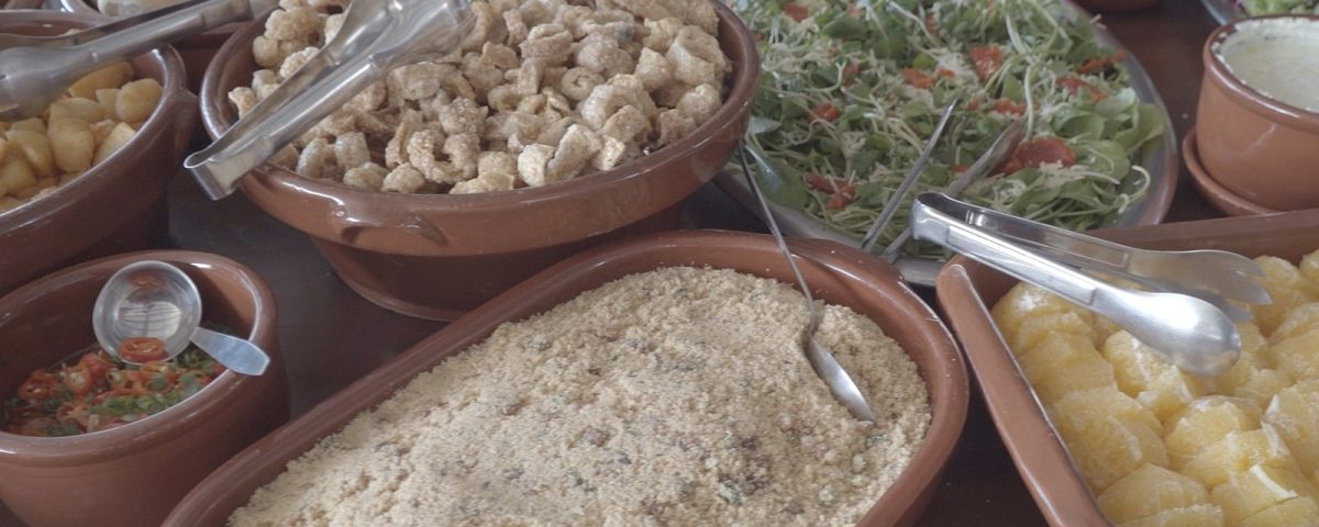 Acompanhamentos: arroz branco, farofa, vinagrete, couve refogada, laranja, pães, vinagrete com pimenta e banana à milanesa.