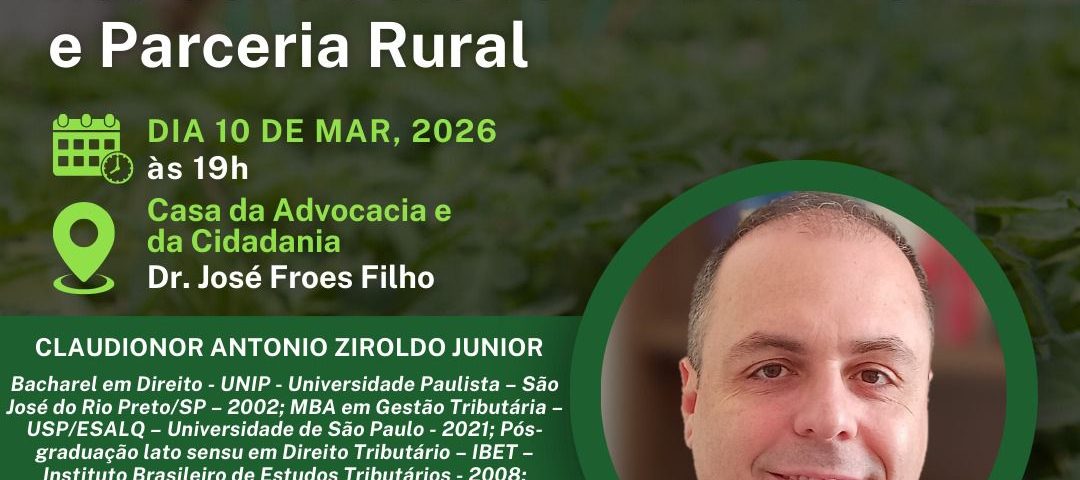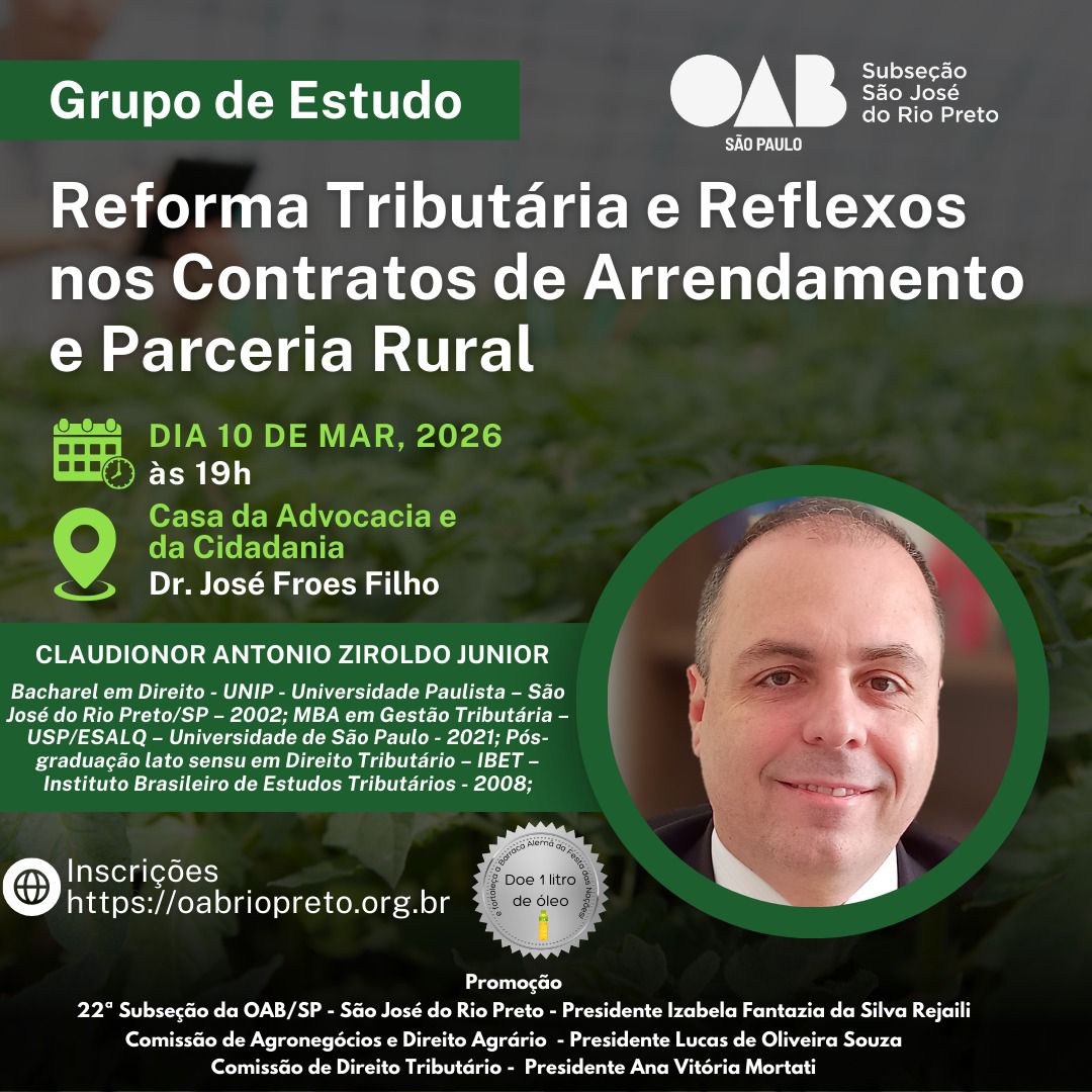 A 22ª Subseção da OAB/SP – São José do Rio Preto realizará, no próximo dia 10 de março de 2026, às 19h, na Casa da Advocacia e da Cidadania “Dr. José Froes Filho”, um Grupo de Estudo presencial e gratuito com o tema: “Reforma Tributária e Reflexos nos Contratos de Arrendamento e Parceria Rural”.