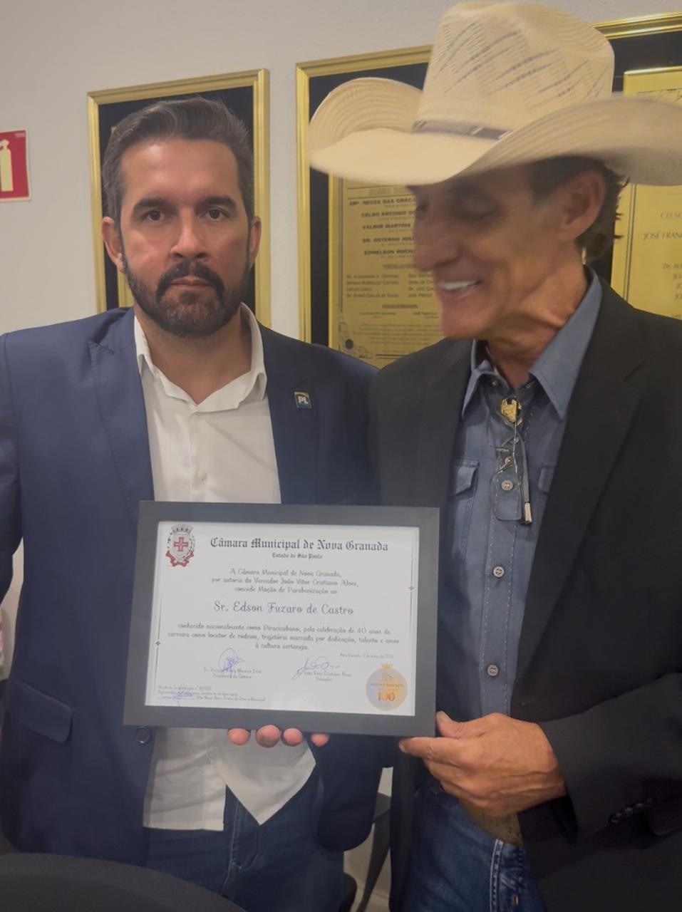 A Câmara Municipal de Nova Granada foi palco, no dia 17 de março, de uma homenagem especial a um dos grandes nomes do rodeio brasileiro. A iniciativa, proposta pelo vereador João Vitor, reconheceu a trajetória de Edson Fuzaro de Castro, o Piracicabano, que celebra 40 anos de carreira como locutor e mais de quatro décadas dedicadas ao universo das arenas.